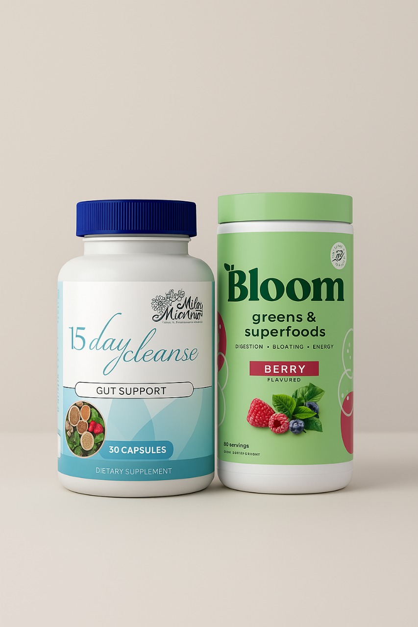 Bloom es un suplemento en polvo diseñado para apoyar la salud intestinal, reducir la hinchazón y elevar tus niveles de energía de forma natural. Su mezcla combina vegetales verdes, superalimentos, probióticos, fibras y antioxidantes, todo con un sabor delicioso a frutas del bosque (berry).